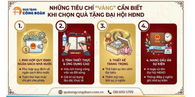 Để đảm bảo món quà vừa làm hài lòng người nhận, vừa đáp ứng các yêu cầu của một sự kiện chính trị quan trọng, ban tổ chức cần nắm vững 4 tiêu chí cốt lõi sau đây: phù hợp ngân sách, tính ứng dụng cao, đóng gói chỉnh chu và in logo ý nghĩa.