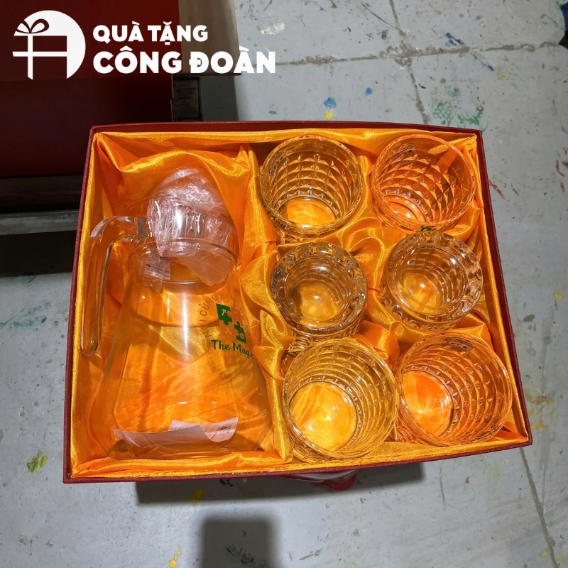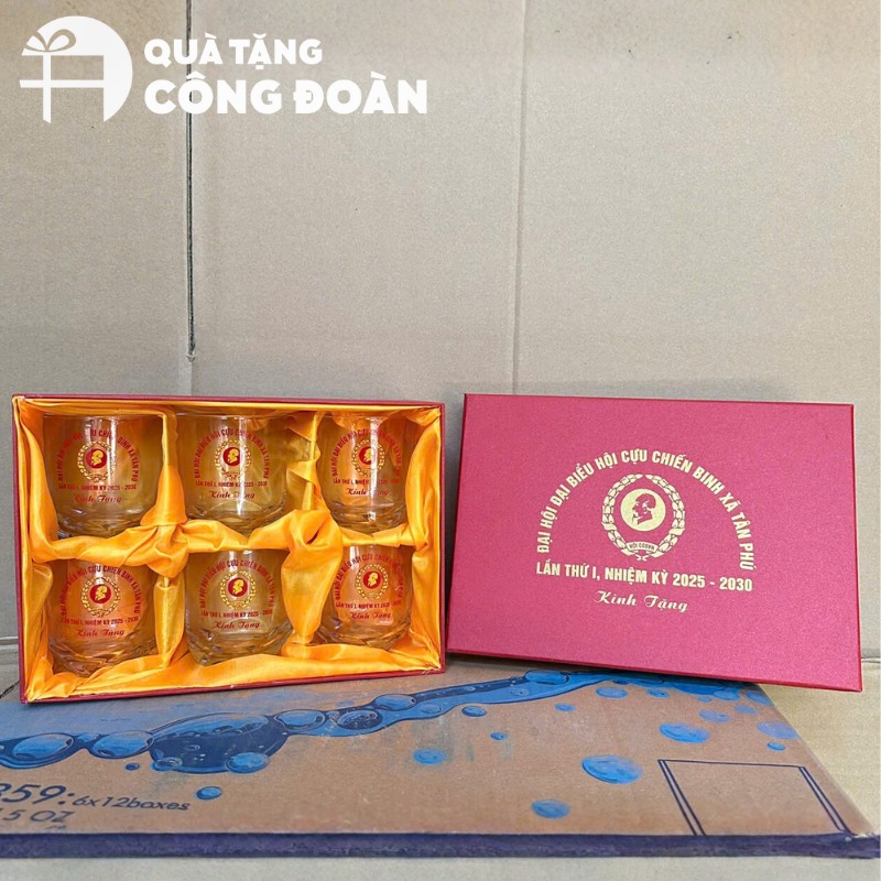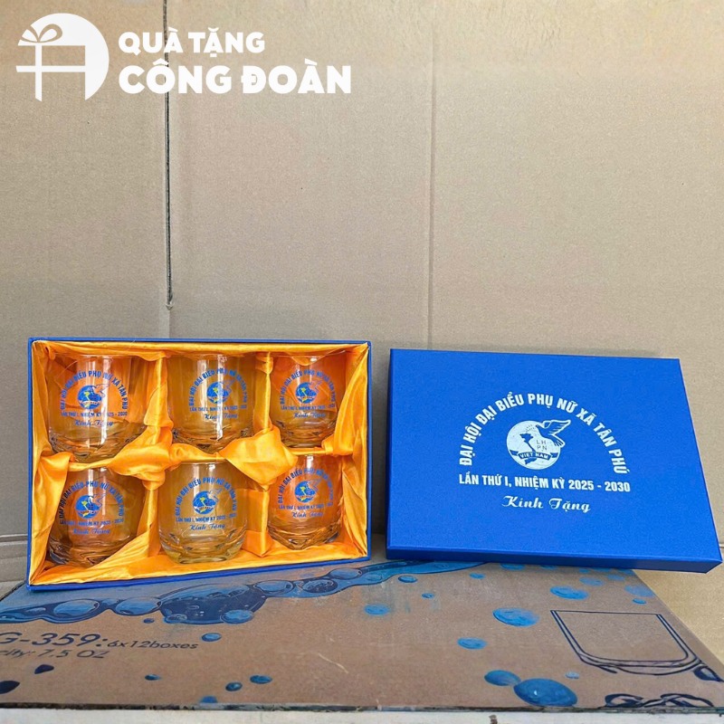 Bộ cốc thủy tinh là quà tặng gia dụng phổ thông, thiết yếu trong gia đình đoàn viên dùng tiếp khách. Món quà trang trọng, phù hợp trao tặng đại biểu cấp cơ sở, đoàn viên tiêu biểu hoặc làm quà tặng đại trà trong hội nghị kỷ niệm.